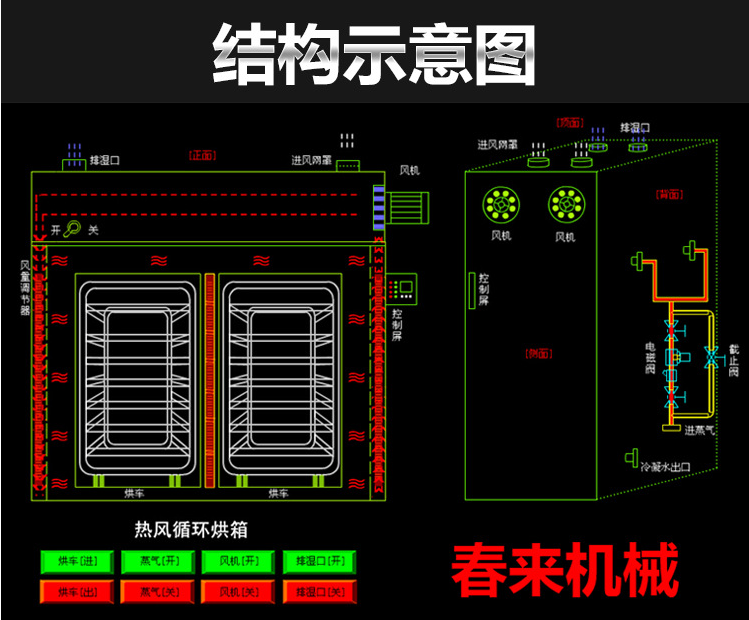 经风道吹入工作室。再有侧面风道或顶部风道(根据不同的送风方式,吸入方式不同),依次不停的循环。随着循环次数增加,使得工作室内的温度越来越高,同时在不停反复循环过后工作室内的温度畅温度越来越均匀,温差越来越小。最终达到工艺要求完成工作。